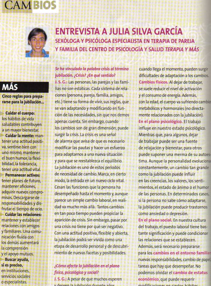 | Entrevista a Julia Silva. | Art�culo | GU�AS BAYARD. C�mo preparar la jubilaci�n y disfrutarla. 2005. | Psicolog�a Preventiva y Promoci�n de la Salud | Completo |