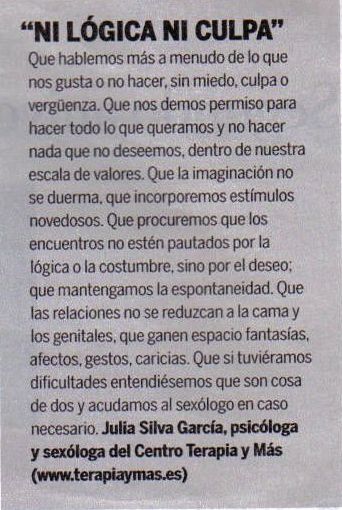 San Ignacio de Loyola de Torrelodones. As� mismo, con distintos medios de comunicaci�n escritos como: las revistas El cuaderno de los padres, AR, La gu�a del ni�o, Mujer hoy, Plus es M�s y Adi�s, El Pa�s Semanal; el diario Qu�; Gu�a Bayard Como preparar la jubilaci�n y disfrutarla. De otra parte, en medios audiovisuales: - En los espacios radiof�nicos Matices de Radio Nacional de Espa�a Radio 5, A d�a de hoy de la emisora Punto Radio, La luna en Cope de esta cadena, en el programa de Cadena Dial Atr�vete y en La hora de los piratas de Gestiona Radio. - En programas de televisi�n como Todos a 100 de La Sexta, La Noria de Tele 5, Locos por Madrid de Onda 6. Con las productoras Sony Pictures Espa�a Televisi�n, Europroducciones TV S.L. y Bocaboca Producciones. El equipo de profesionales participa, adem�s, en otras actividades p�blicas, entre ellas, conferencias en encuentros como Sal�n Single Ind. Life. A continuaci�n le ofrecemos referencias sobre algunos de los art�culos y otras colaboraciones del equipo. Si desea m�s informaci�n sobre ellos, no dude en contactar con nosotros. |